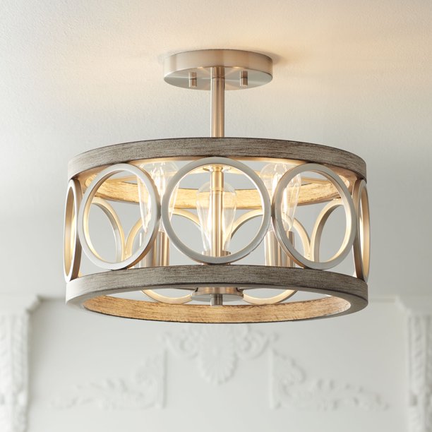 Franklin Iron Works Rustic Farmhouse Ceiling Light Semi Flush Mount Fixture Brushed Nickel Gray Wood Finish 16 Wide Drum Edison Bedroom Walmart Com